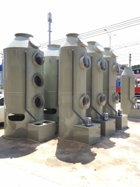 本工藝采用兩臺(tái)自主設(shè)計(jì)的改型的噴淋塔串聯(lián)使用。風(fēng)機(jī)安置于兩塔之間,以防止其被油性氣體污染腐蝕,同時(shí)保證抽風(fēng)效果。噴淋塔,在極性吸收液的作用下吸收極性有機(jī)分子,進(jìn)行除油、除煙塵凈化處理;處理后的廢氣經(jīng)過風(fēng)機(jī)進(jìn)入2#噴淋塔,在非極性吸收液的作用下吸收非極性有機(jī)分子,進(jìn)行除異味凈化處理,達(dá)標(biāo)排放。噴淋塔是藥劑噴淋處理工藝中的關(guān)鍵設(shè)備。針對(duì)PVC塑料生產(chǎn)廢氣,設(shè)計(jì)采用PP材質(zhì)的噴淋塔。噴淋塔內(nèi)部由隔層隔開。